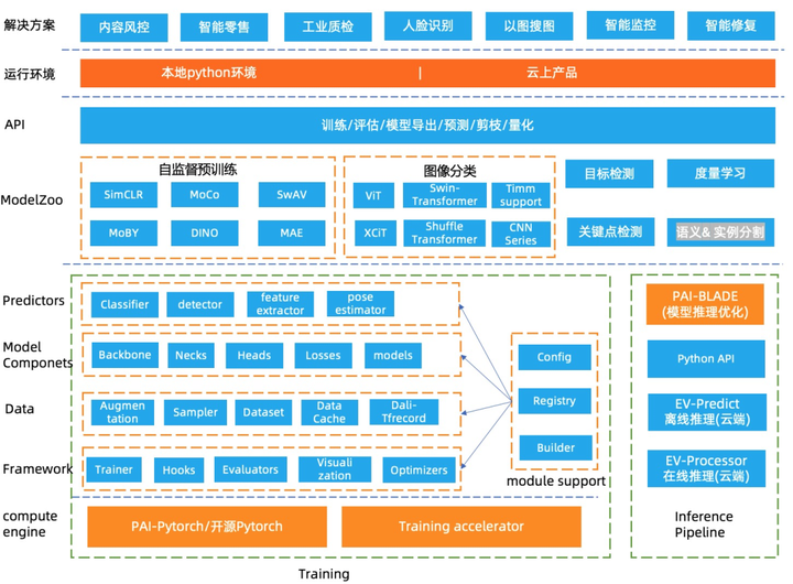 - 推理:EasyCV提供了端到端的推理API接口,支持PAI-Blade进行推理优化,并在云上产品支持离在线推理。