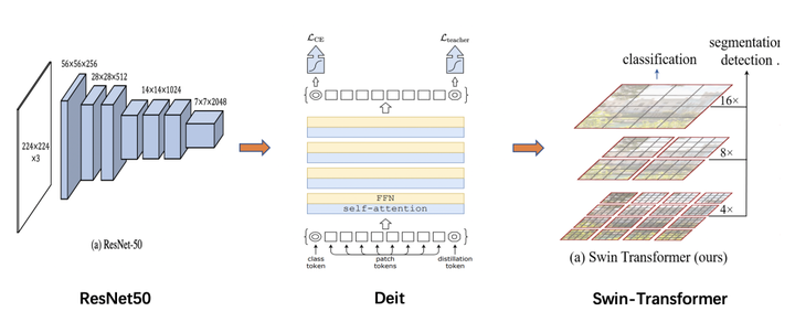 CNN作为主干网络,配合各种下游任务的head,是CV模型常用的结构。EasyCV提供了多种传统的CNN网络结构,包括resnet、resnext、hrNet、darknet、inception、mobilenet、genet、mnasnet等。随着视觉Transformer的发展,Transformer在越来越多的领域替代CNN,成为表达能力更强的主干网络。框架实现了常用的ViT、SwinTransformer等, 同时引入了PytorchImageModel(Timm) 用于支持更为全面的Transformer结构。