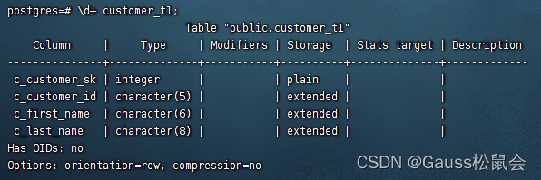 使用gsql的\d+命令查询表的属性。