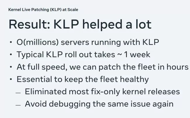 之所以选择 KLP,Meta 称主要是为了减少内核更新时的服务器停机时间——以应对永无止境的安全更新。毕竟完全重启服务器和冗长的 POST 时间会带来相当大的问题,而通过热补丁,当一切按计划进行时,服务器可以近乎无缝地迁移到新内核。
