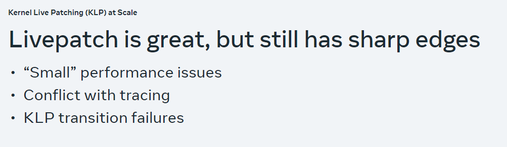 Meta 工程师在使用 Linux 内核的热补丁功能过程中,发现了一些需要克服的追踪问题,也遇到了性能问题。具体的性能问题是,在进行热补丁期间会有 1~2 秒出现问题,比如更高的 I/O 和 fsync 延迟,以及更高的 TCP 重传率。