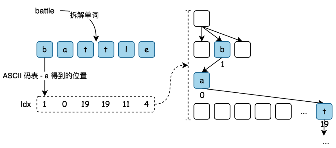 这是一个把 battle 单词字符串,按照字母拆分到字典树进行存放的图。 -