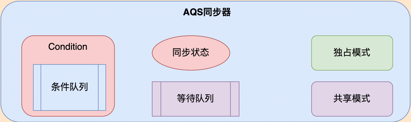 一个标准的AQS同步器主要有同步状态机制,等待队列,条件队列,独占模式,共享模式等五大核心要素组成。