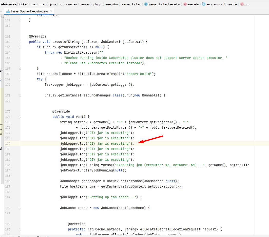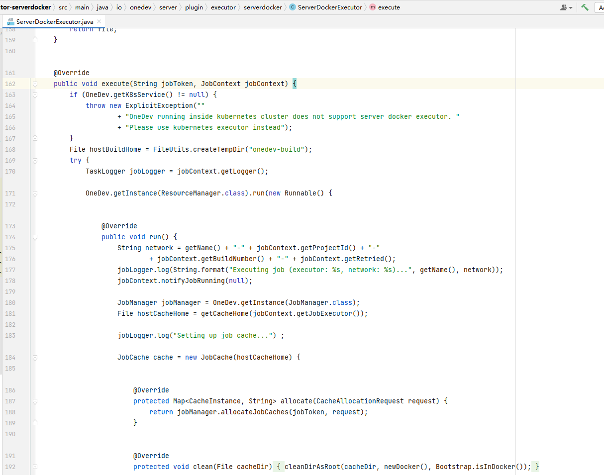 build功能代码对应为io.onedev.server-plugin-executor-serverdocker-7.4.14.jar中的ServerDockerExecutor类。如果攻击者能将其替换为自己定义的恶意jar包,将会远程执行攻击者可控的代码。