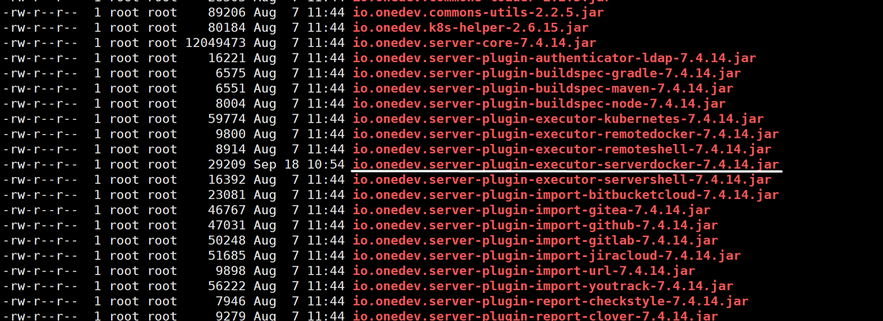 - 此时进入oneDev服务器“/opt/onedev/lib”目录进行查看,发现原来的“io.onedev.server-plugin-executor-serverdocker-7.4.14.jar”已经替换成攻击者上传的jar包。