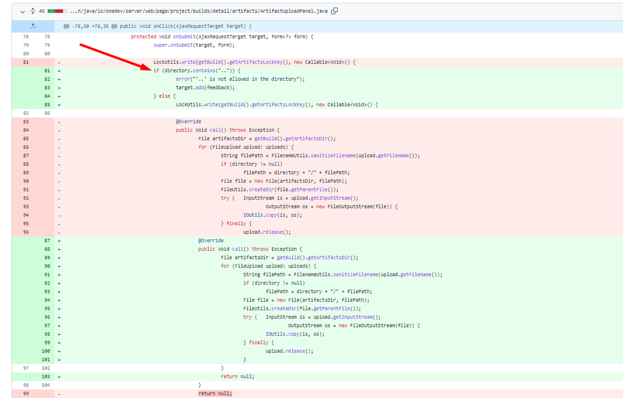下图为 onedev v7.4.15针对路径遍历漏洞的修复代码: