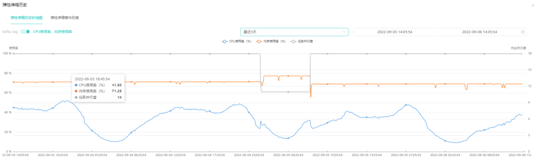 弹性伸缩效果图如下,通过途中可以看出,作业在cpu利用率低时,自动降低的并发。