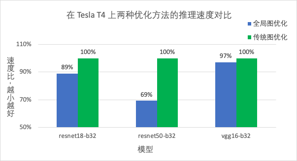 在 int8 模型上,经过全局图优化和 MegEngine 原 Format 优化方法(传统图优化)的推理时间表现对比如下图:
