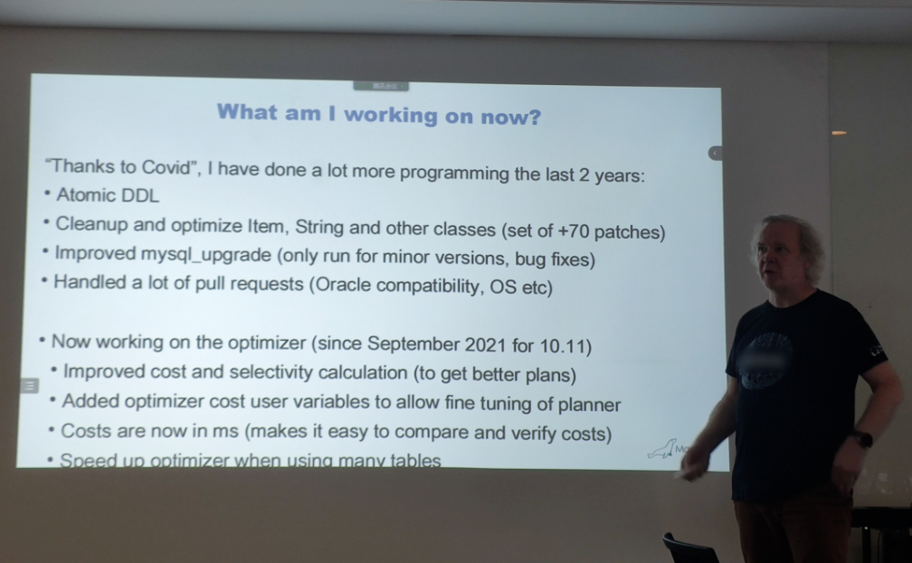 下午就是一些嘉宾的分享了,在分享的过程中,Monty会和演讲者互动,并且当场还带着笔记本电脑写代码与现场的开发者交流,真令人佩服,在中国,60岁还奋斗在一线的程序员,应该蛮少的。即便是在芬兰,年轻的创业公司里也是年轻人居多,不过,Monty倒是很自豪的说,MariaDB公司里有很多超过40岁的“大龄”程序员,这让他们的每一行代码都是经过深思熟虑才写上去的,总的来说,还是很稳健的。而且,MariaDB公司的人员实际上并不多,如Monty经常讲的,他们是开源公司,是“Virtual company”,远程协作,这让他们更加容易找到优秀的工程师(原话是:“Virtual Company” made it easy to find good people)。