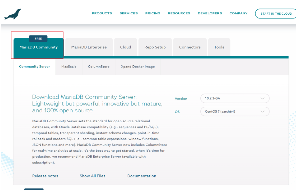 而在MariaDB Corporation的官网上,我们可以看到有这么几个产品选项,分别是MariaDB Community、MariaDB Enterprise、Cloud、Repo Setup、Connectors和Tools。