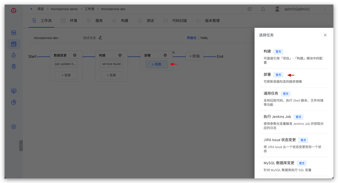 部署阶段 -> 点击「+ 任务」-> 选择 「部署」。 - 配置任务名称