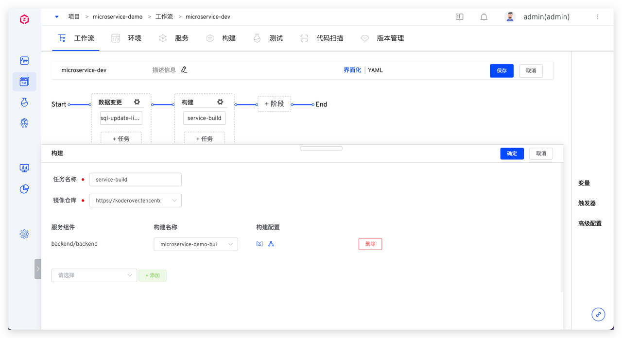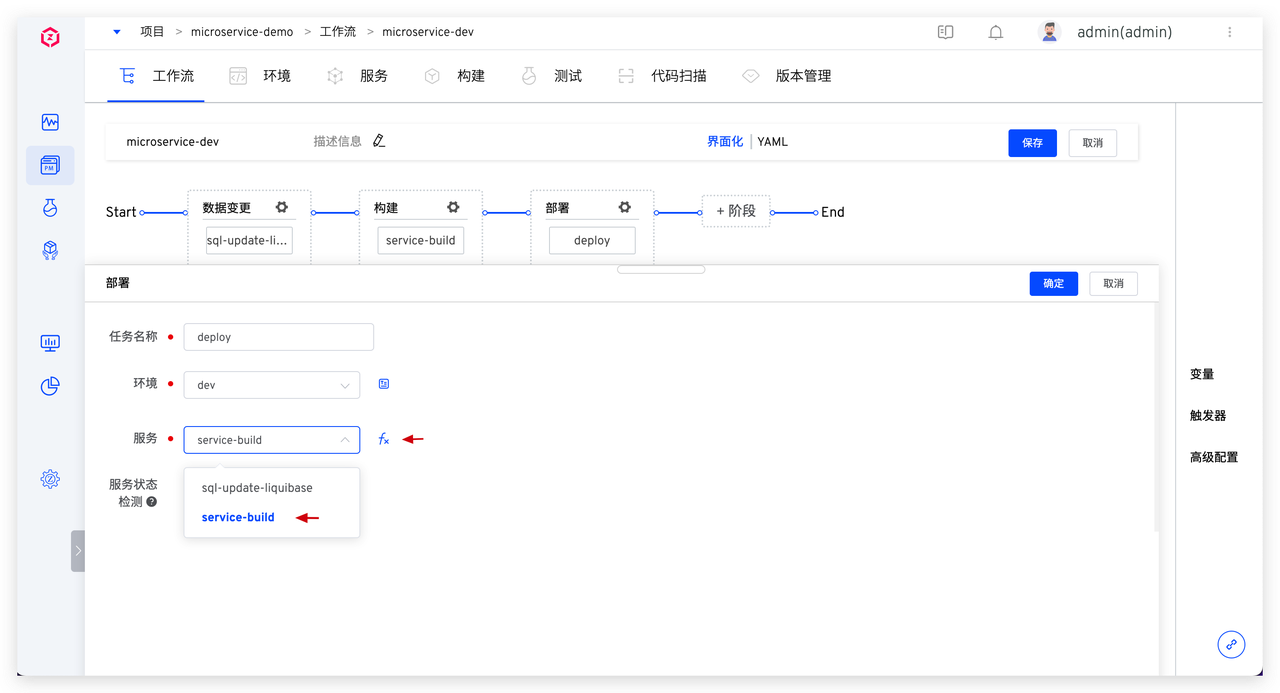 工作流任务配置完成后,点击「保存」。至此已完成 microservice-dev 工作流任务的配置,其他工作流的具体配置类似,不再赘述。
