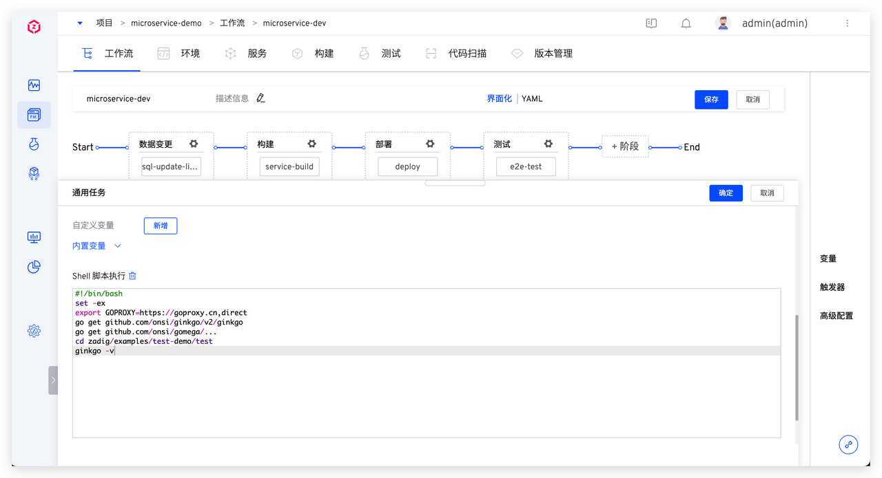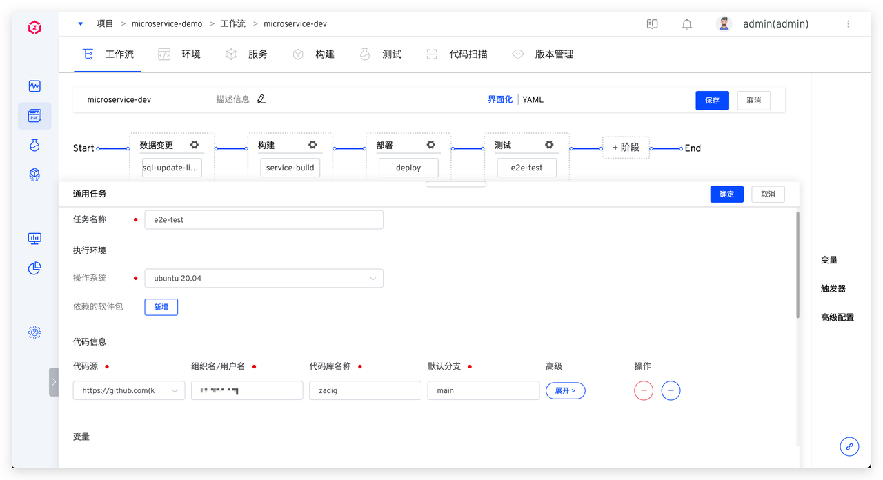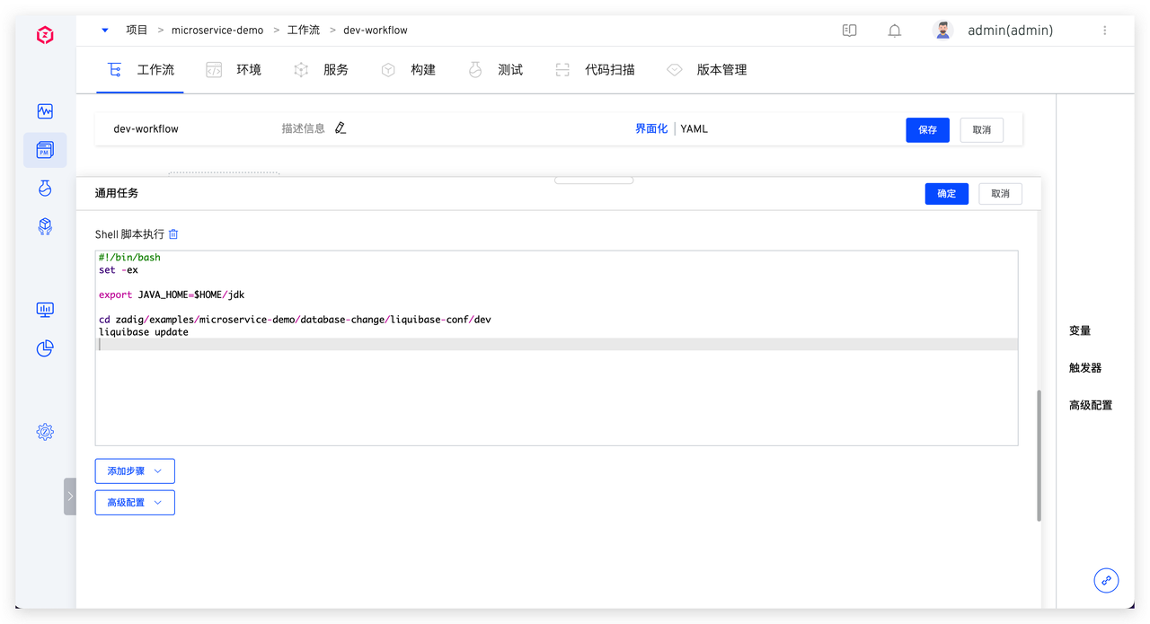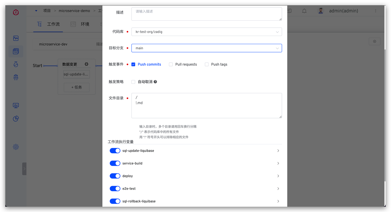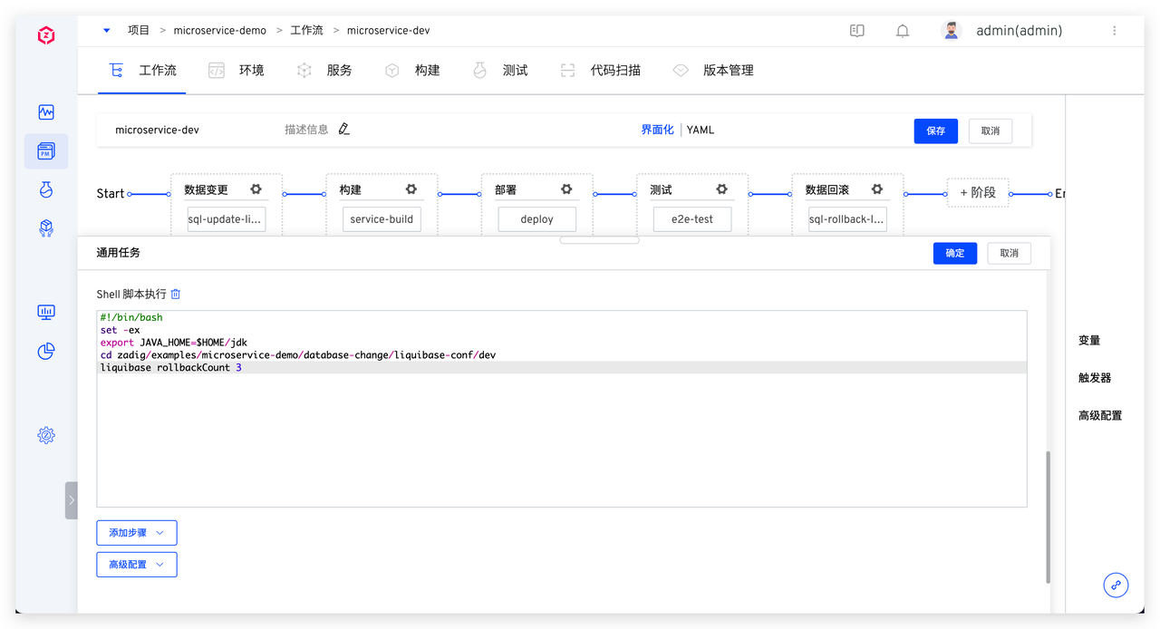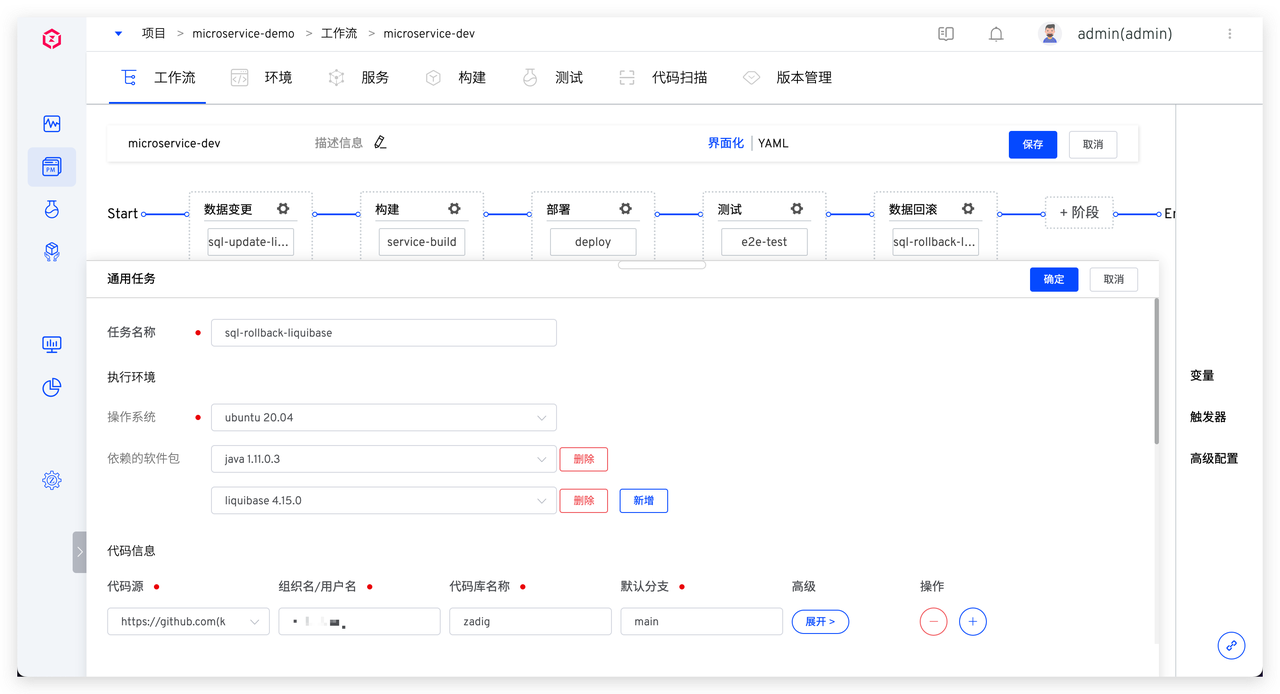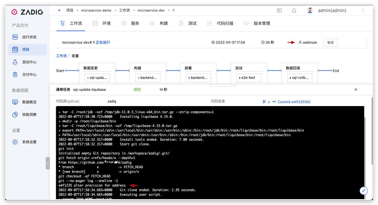 - 代码审核人员对开发提交的 Pull Request 内容进行审核,通过后合并。自动触发 Zadig 工作流的执行,包含任务:Liquibase 数据变更、服务构建、部署 dev 环境、测试、Liquibase 数据回滚。
