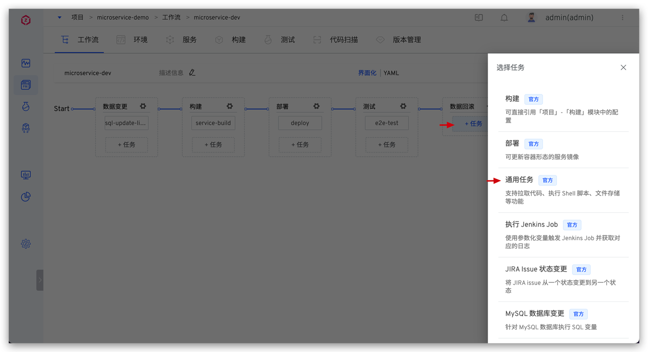 数据回滚阶段 -> 点击「+ 任务」-> 选择 「通用任务」。 - 添加任务