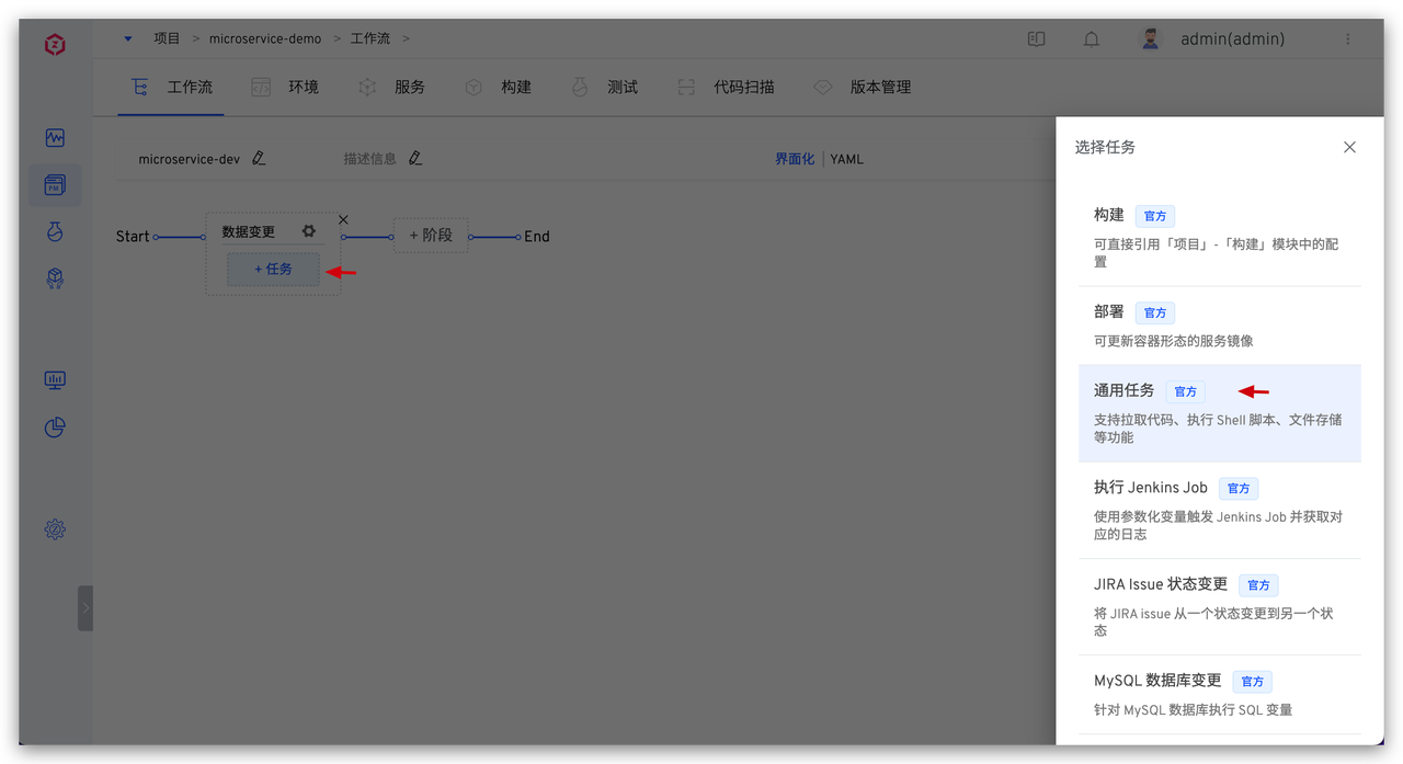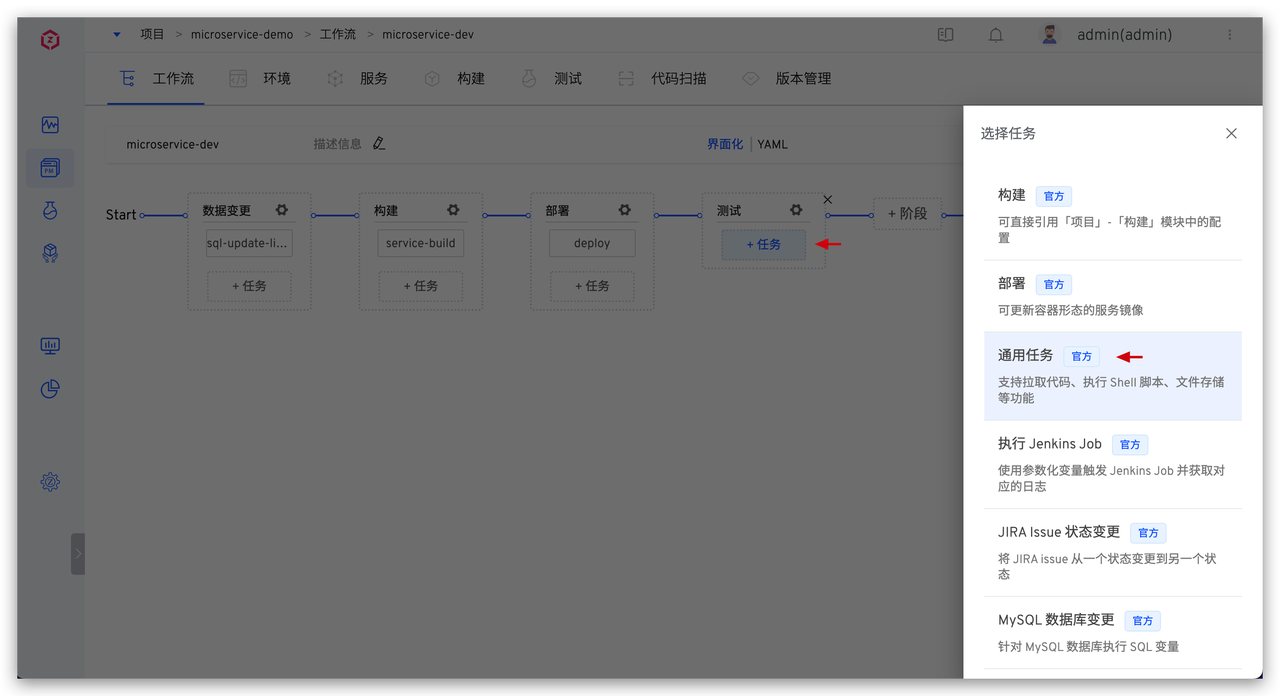 测试阶段 -> 点击「+ 任务」-> 选择 「通用任务」。 - 添加任务