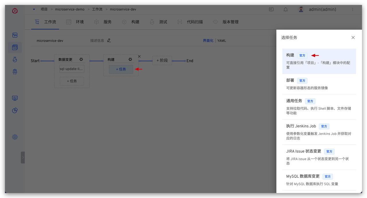 构建阶段 -> 点击「+ 任务」-> 选择「构建」。 - 配置任务名称