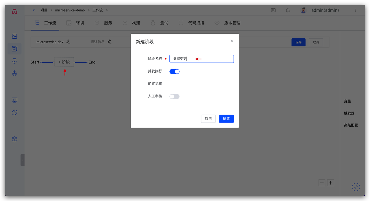 - 添加阶段:点击 「+ 阶段」-> 填写阶段名称 数据变更 。