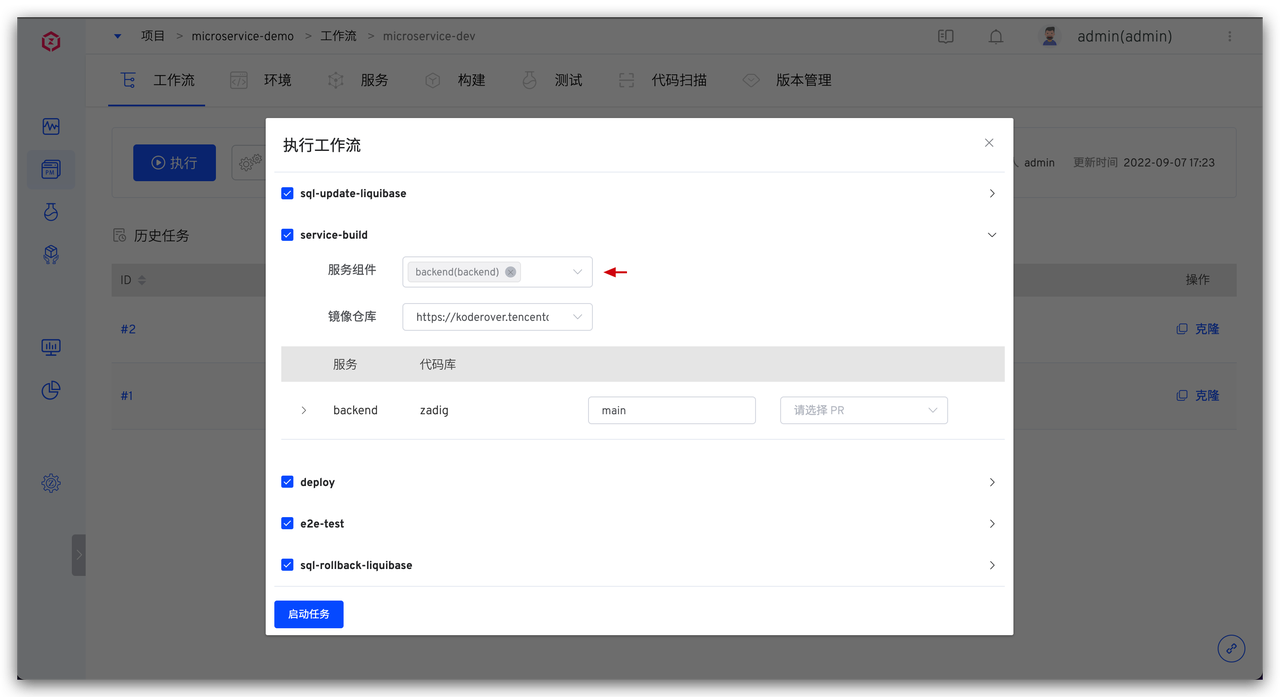 点击「执行」,确认执行变量,选择对应需要更新的服务组件和代码信息,点击「启动任务」。