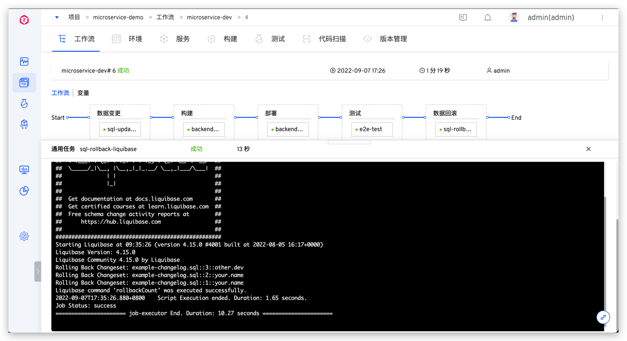 数据变更 -> 构建 -> 部署 -> 测试 -> 数据回滚。点击 sql-change-liquibase 任务可查看 Liquibase 数据变更执行过程的详细日志。