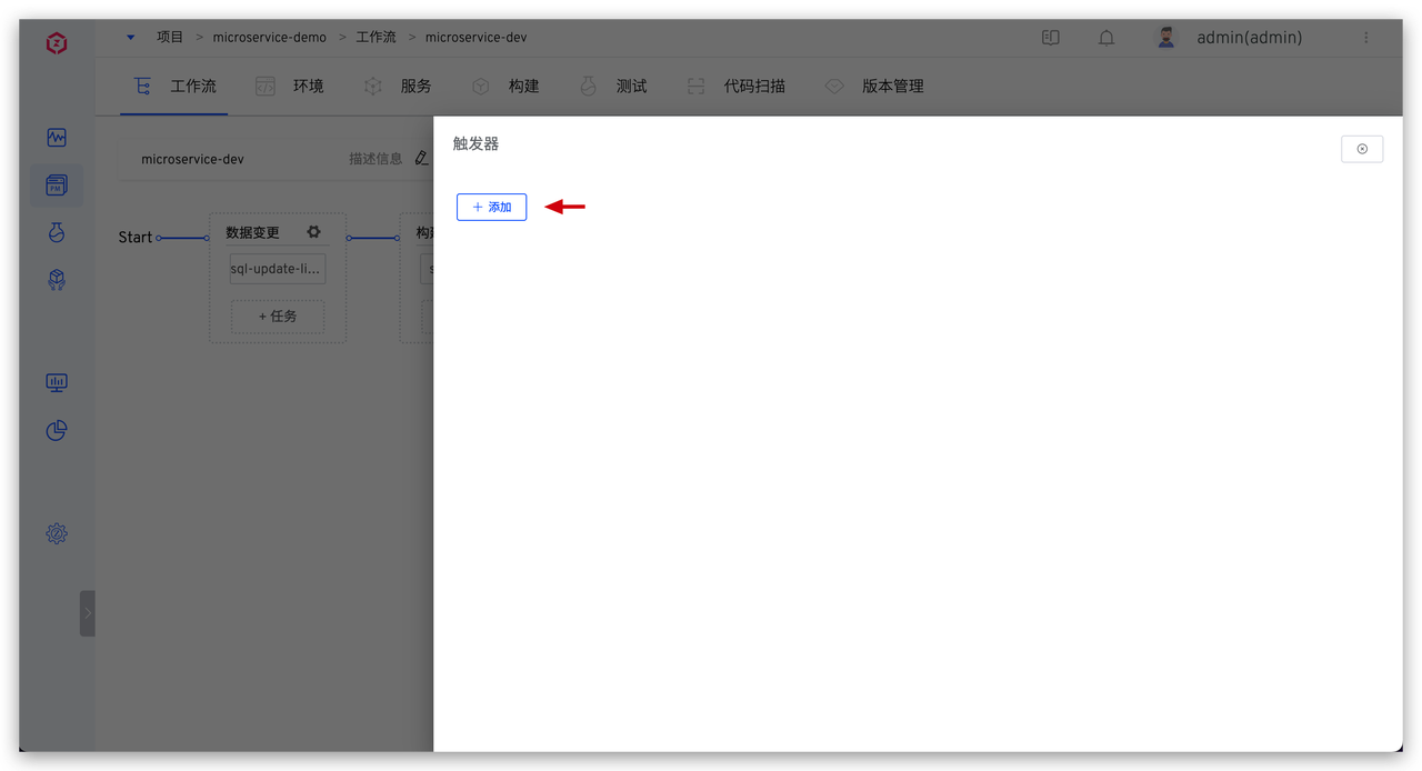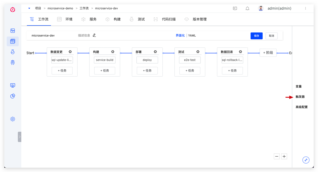 - 配置触发器。配置代码库信息、触发事件和工作流执行变量等。