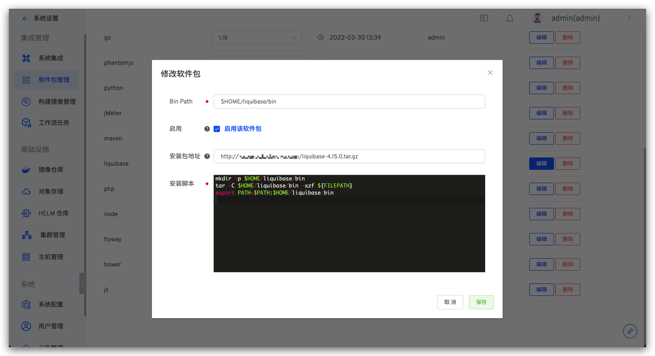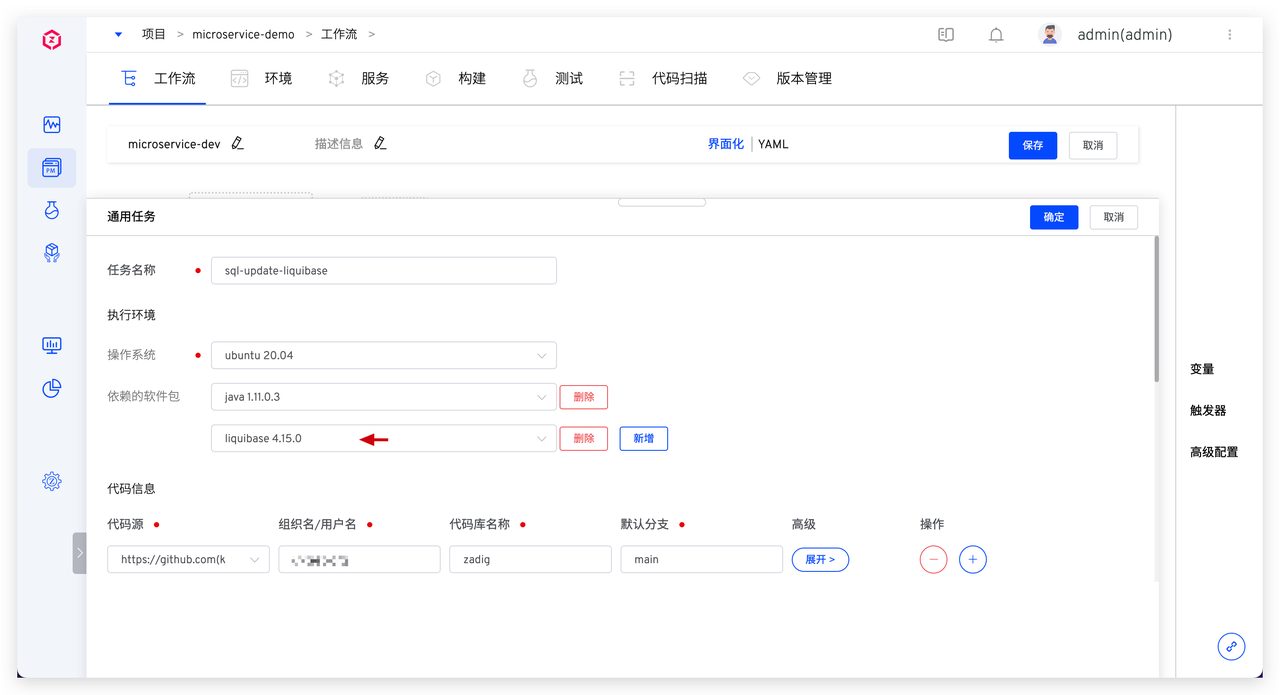 - 配置通用任务,执行 liquibase update。具体操作为:新建 liquibase 软件包:从 Liquibase 官网下载安装包,添加到 Zadig 的软件包管理。具体添加方式参考:软件包管理 | Zadig 文档。