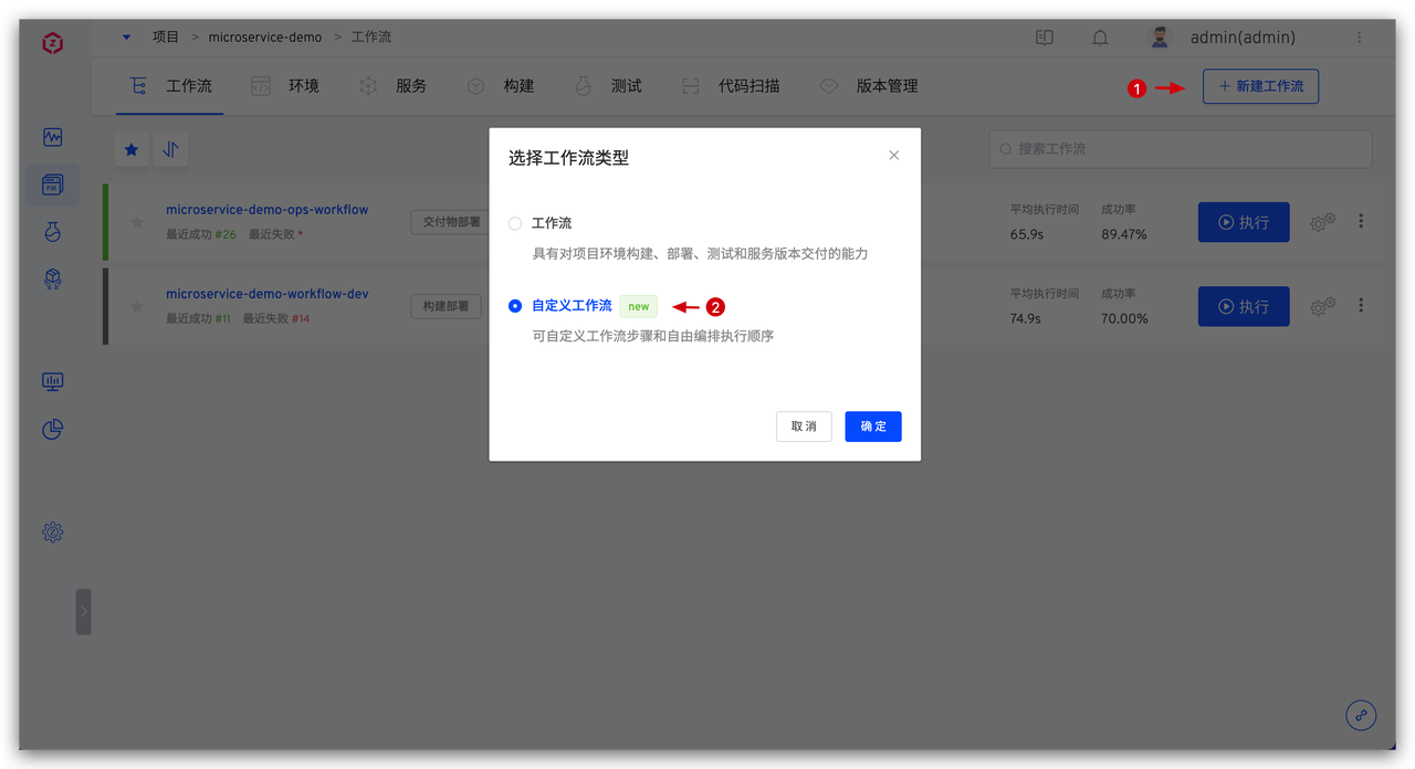 点击 「新建工作流」-> 选择「自定义工作流」-> 输入工作流名称 microservice-dev。