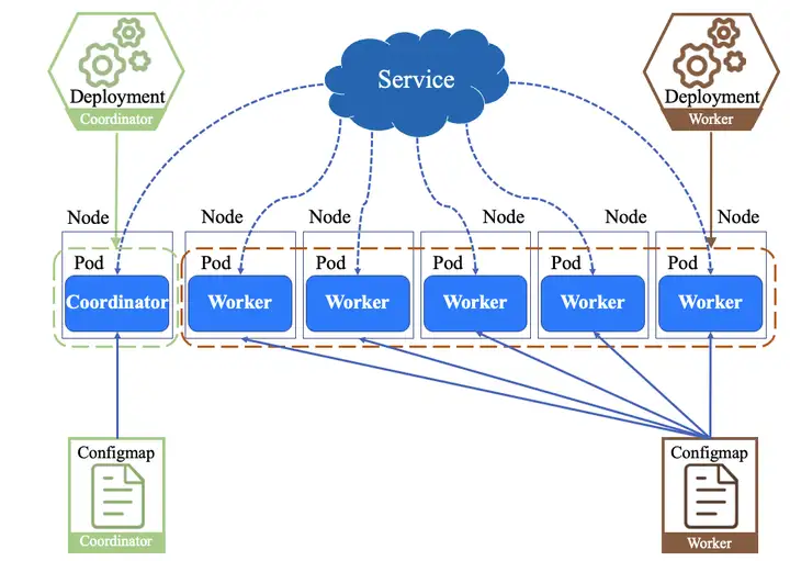 Configmap用来存储配置文件,Coordinator和Worker的配置信息分别通过Configmap进行存储,每次进行配置更改,只需要修改Configmap里面的配置信息,Coordinator和Worker就会更新相应的配置信息。