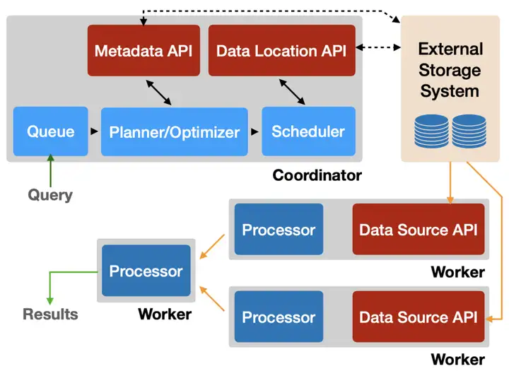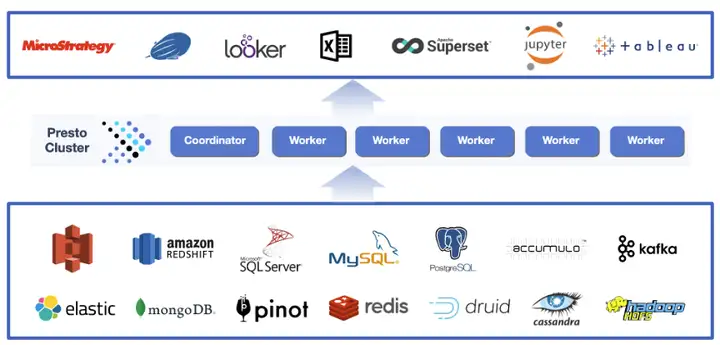 Presto 集群由一个Coordinator和一个或多个Worker组成。Coordinator负责接纳、解析、规划和优化查询以及查询编排,Worker负责查询处理。Presto通过Connector适应底层不同类型的数据源,以便访问各种数据源中的数据。如图3显示了 Presto 架构的简化视图(详见参考[2] )。