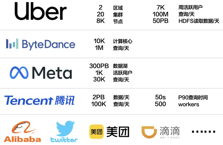 Meta公司(Facebook)使用 Presto 对多个内部数据存储进行交互式查询,包括300PB 数据湖。每天有超过 1,000 名 Facebook 员工使用 Presto 运行 30,000 多个查询,平均每个查询扫描超过 1 PB。