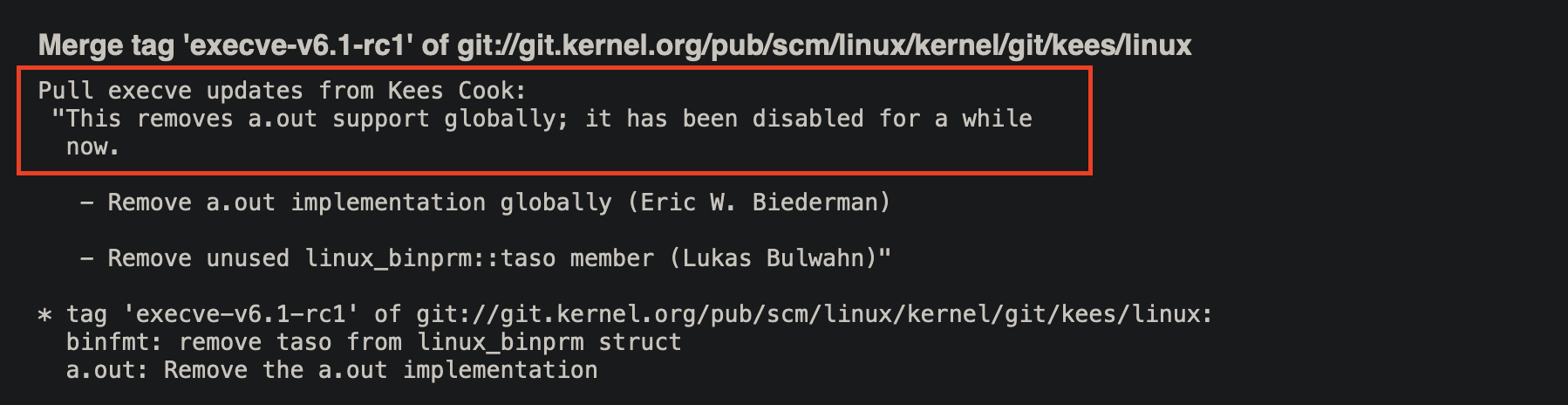 这次代码清理也实现此前承诺的在 2022 年从 Linux 内核中删除所有 a.out 相关内容的目标。