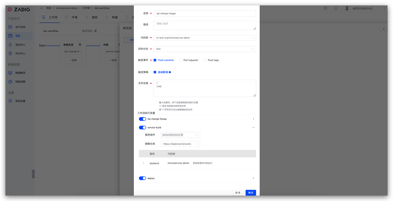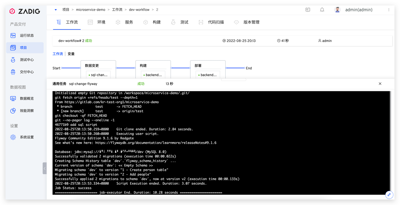 - 代码审核人员对开发提交的 Pull Request 内容进行审核,通过后合并。自动触发 Zadig 工作流的执行,包含任务:Flyway 数据变更、服务构建、部署 dev 环境、测试。