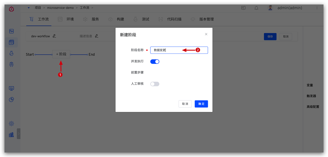 添加阶段。点击 「+ 阶段」-> 填写阶段名称 数据变更 。