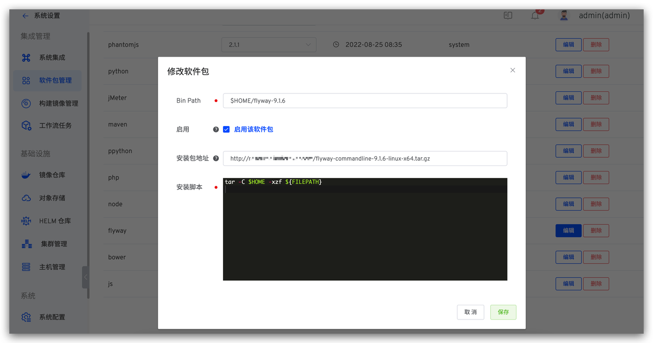 a. 新建 flyway 软件包。从 Flyway 官网下载安装包,添加到 Zadig 的软件包管理。具体添加方式参考:软件包管理 | Zadig 文档