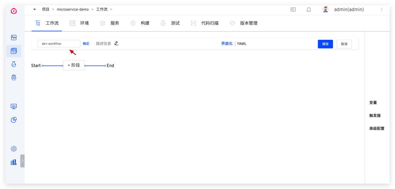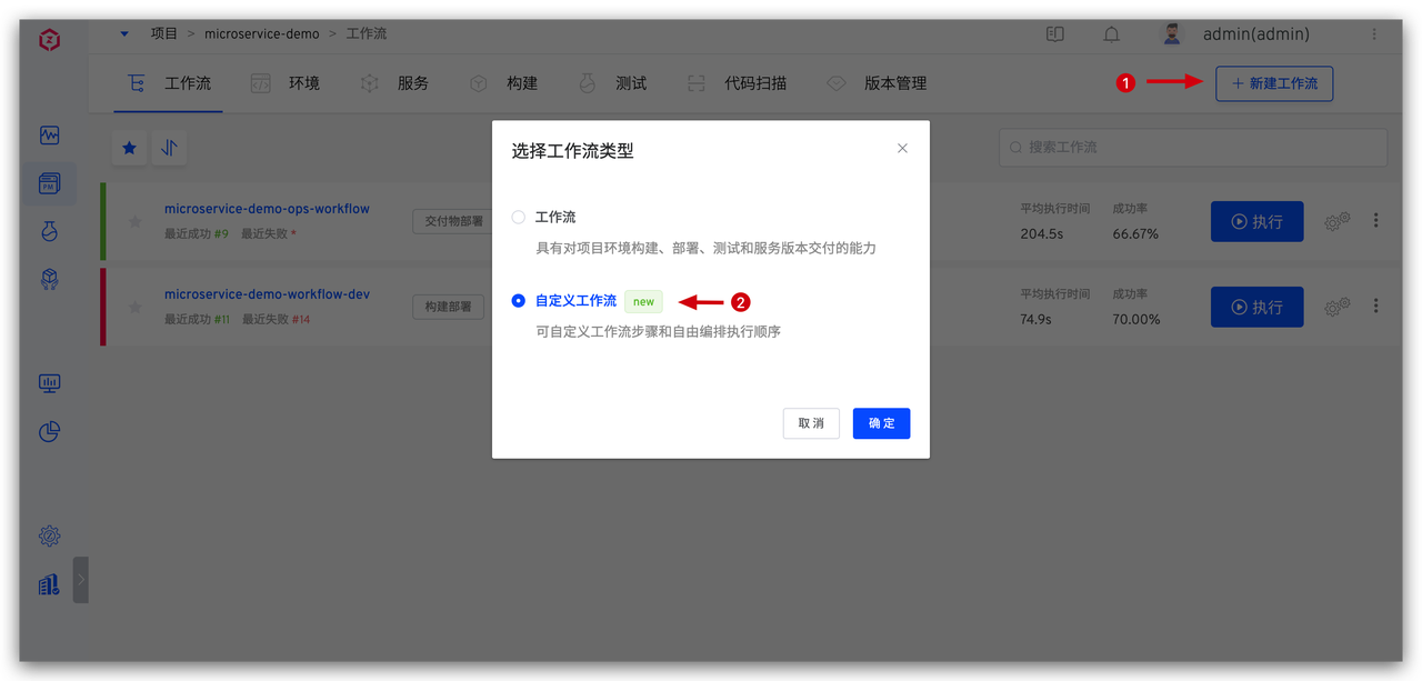 点击 「新建工作流」-> 选择「自定义工作流」-> 输入工作流名称 dev-workflow。
