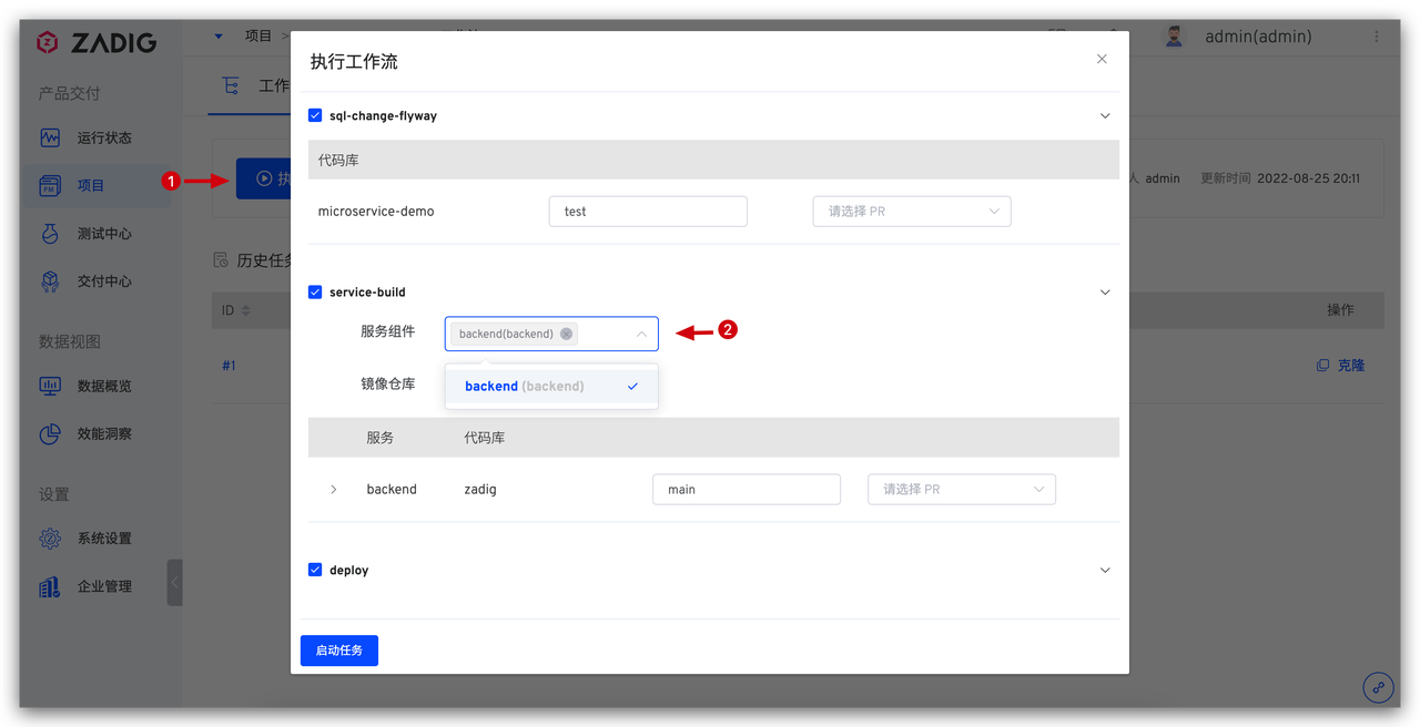 点击「执行」,确认执行变量,选择对应需要更新的服务组件和代码信息,点击「启动任务」。