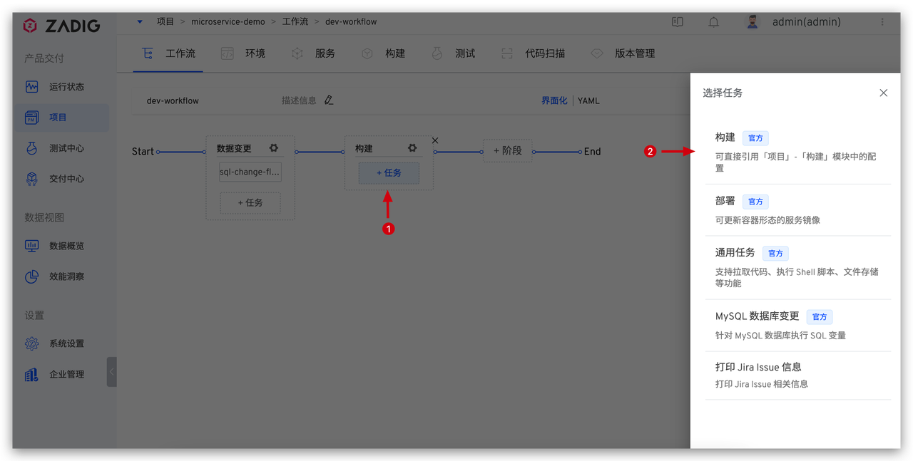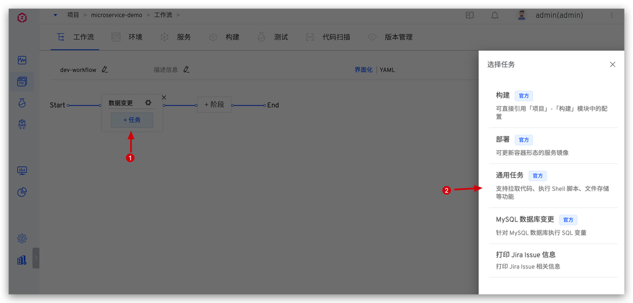 - 添加构建阶段 -> 点击「+ 任务」-> 选择「构建」。
