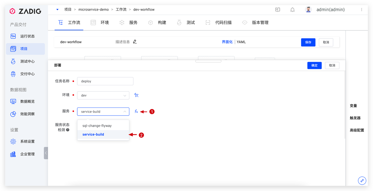 deploy-> 选择 dev 环境 -> 选择服务来源:其他任务输出,选择构建任务service-build,点击「确定」。