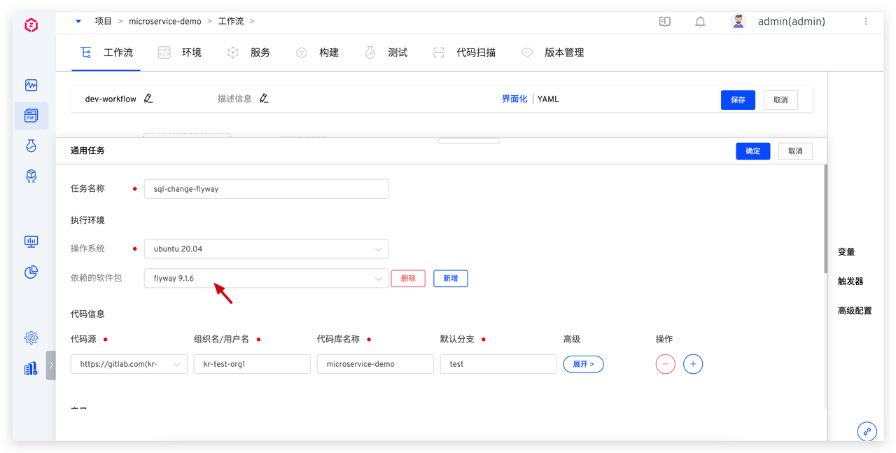工作流任务配置完成后,点击「保存」。至此已完成 dev-workflow 工作流任务的配置,其他工作流的具体配置类似,不再赘述。