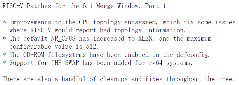 对于使用 Linux 6.1 的 RISC-V 来说,这项变化还为 RISC-V 64 位系统启用了透明巨大页面交换 (TH_SWAP, transparent huge-pages swap),默认 NR_CPUS 容量已经增加到 512,并且对 RISC-V 的 CPU 拓扑子系统进行了优化。后者现在支持 RISC-V 在更多的配置中报告正确的 CPU 拓扑信息。