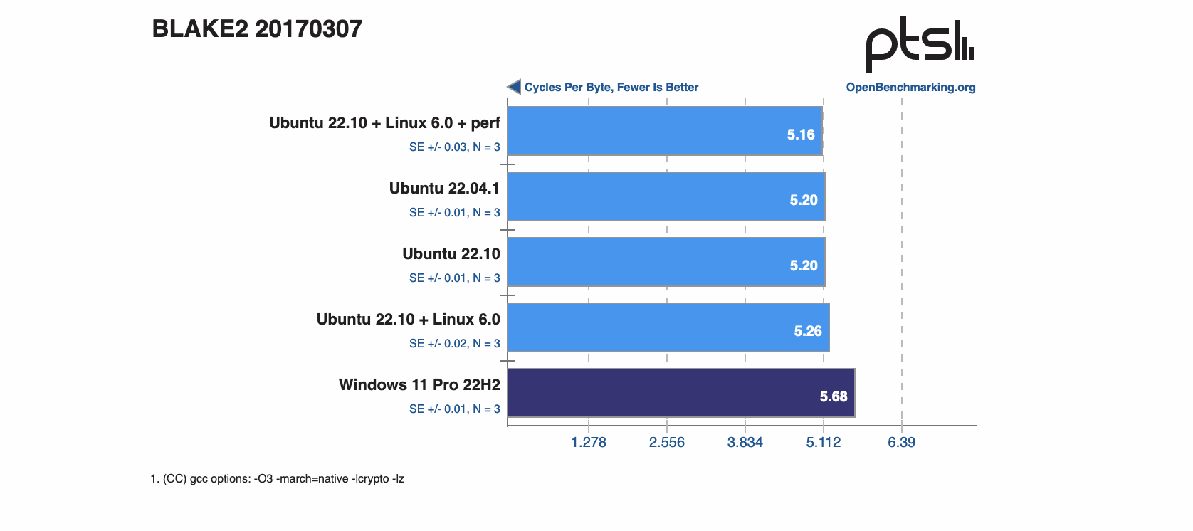- BLAKE2 是 MD5 和 SHA-2/3 的一个高性能加密替代方案(分数越低越好)。