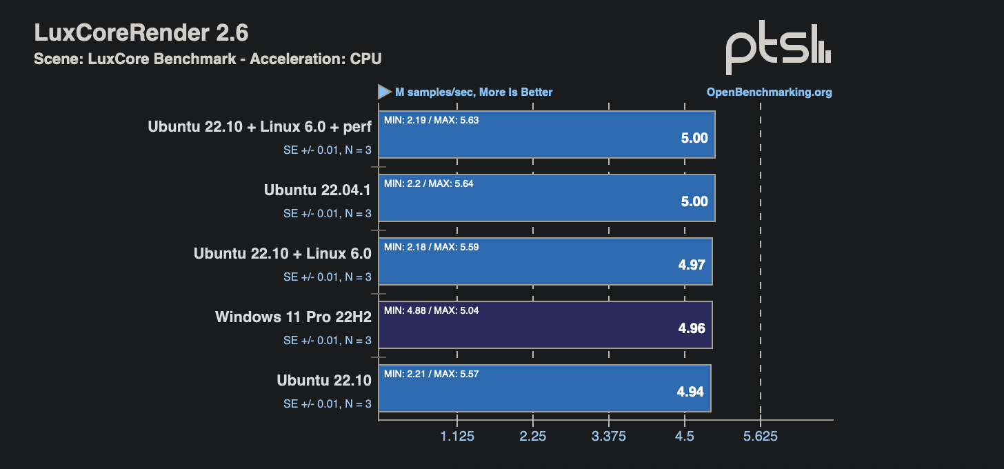 - 同样是上述 Ubuntu 22.10 + Linux 6.0 的组合,但切换到 amd-pstate performance。默认情况下,Ubuntu 22.10 在 Zen 架构的处理器上使用 amd-pstate schedutil 驱动,而这次则选择更激进的 CPU 频率来最大化性能。