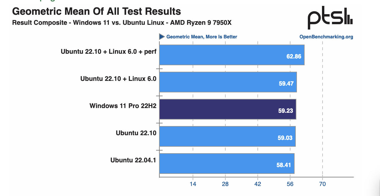 既然产品已经上市,那么拿来测试一下不同系统在该系列 CPU 上的性能差异也是不能少的一个环节。日前外媒 Phoronix 拿到了 AMD 此次最强的处理器 —— Ryzen 9 7950X,他们将测试微软 Windows 11 22H2、Ubuntu 22.04.1 LTS 和即将推出的 Ubuntu 22.10 在该处理器下的性能基准测试。