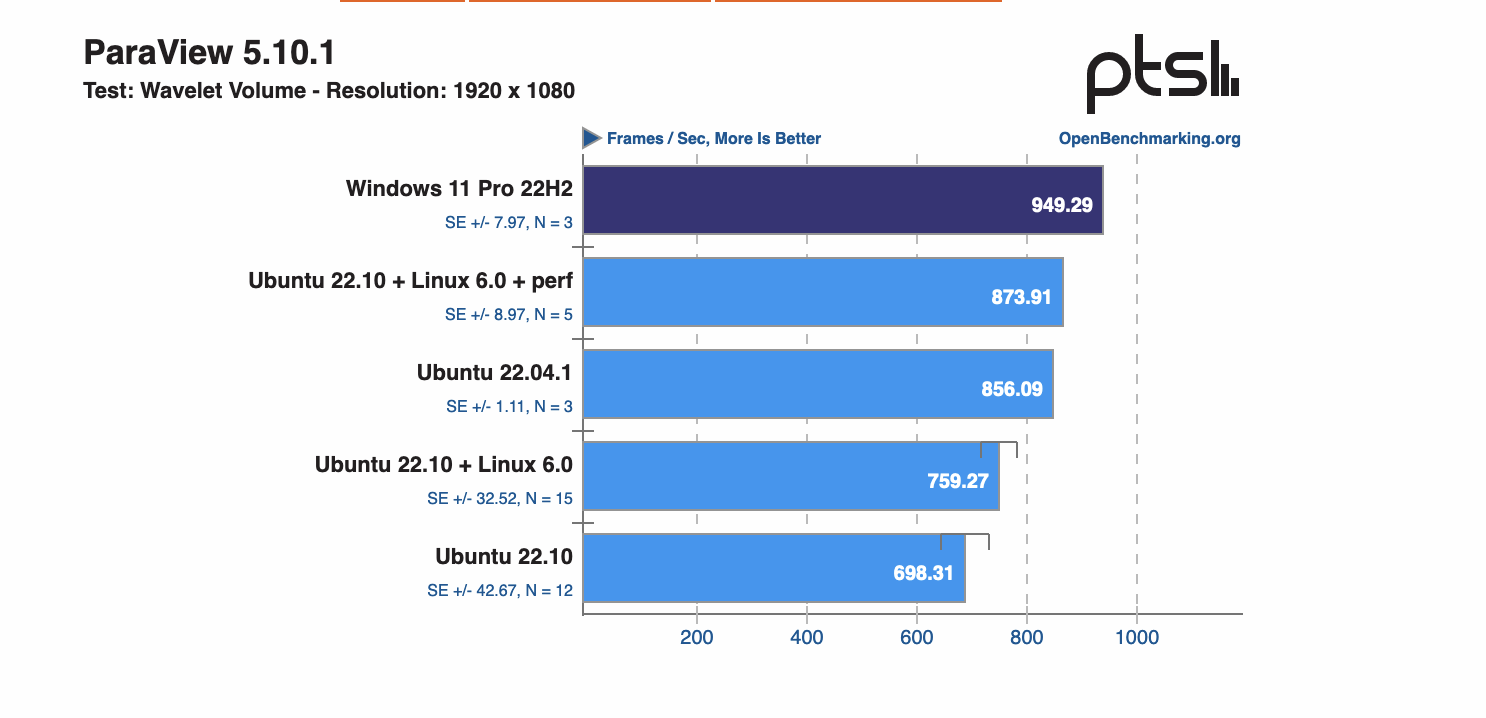 - ParaView 基准:一个开源的数据分析和可视化应用程序。ParaView 用户可以快速建立可视化,使用定性和定量技术分析他们的数据(分数越高越高)。