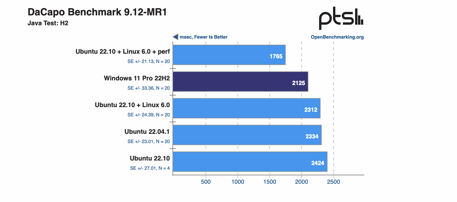 - 该测试运行用 Java 编写的 DaCapo 基准测试,旨在测试系统/CPU 性能(分数越低越好)。