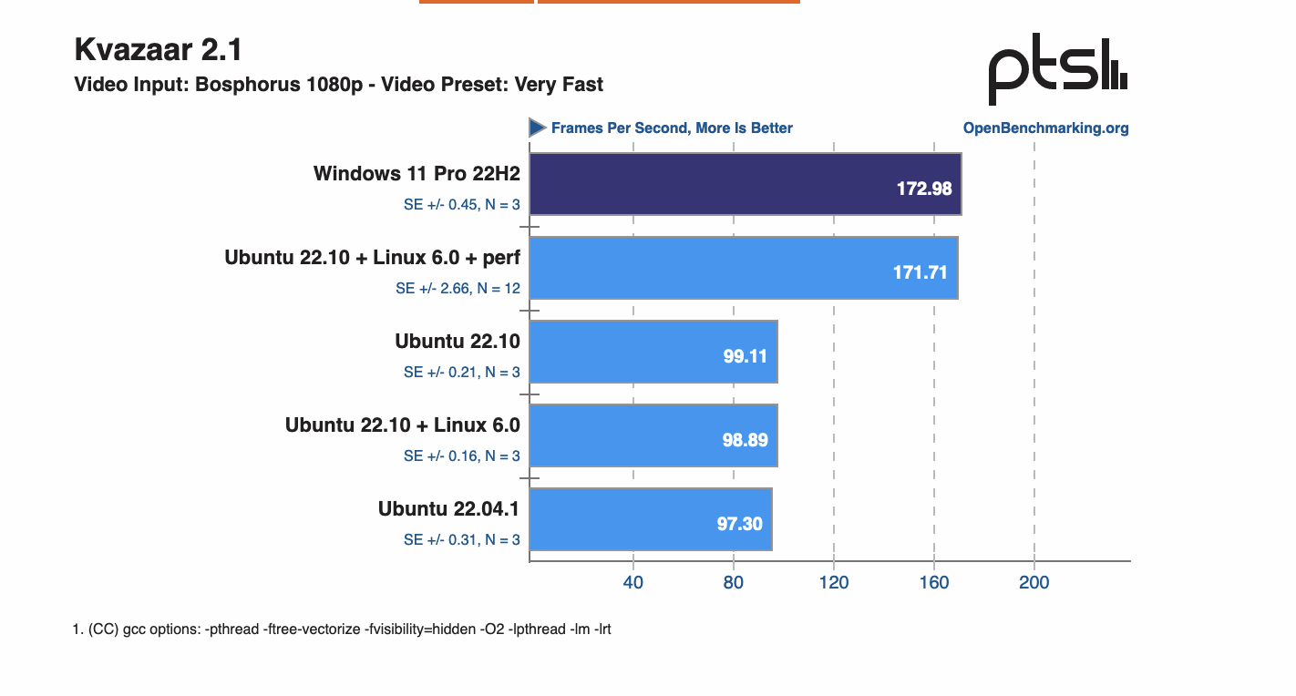 这次基准测试一共进行的 109 项不同的项目,上图是所有 109 项测试结果汇总之后的几何平均数。从图中也能看出,Windows 11 Pro 22H2 与开箱即用的 Ubuntu Linux 在性能上基本保持一致,可以说几乎没有差距(最下面的四项),无论是目前的稳定版 Ubuntu 22.04.1,还是接近最终发布的 Ubuntu 22.10,甚至是将内核升级到 Linux 6.0 也没有产生任何太大的性能差异。Ubuntu 仅仅是在用户手动将 amd-pstate schedutil 默认配置切换到更为激进的 performance 后,才让这个处理器的性能总体上提高了大约 6%。
