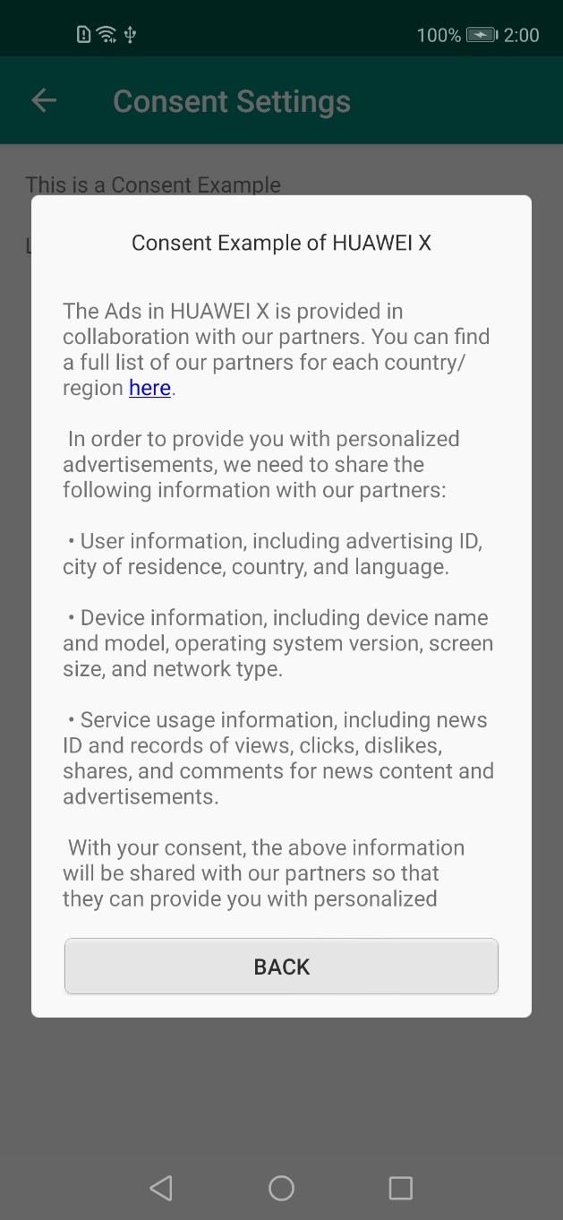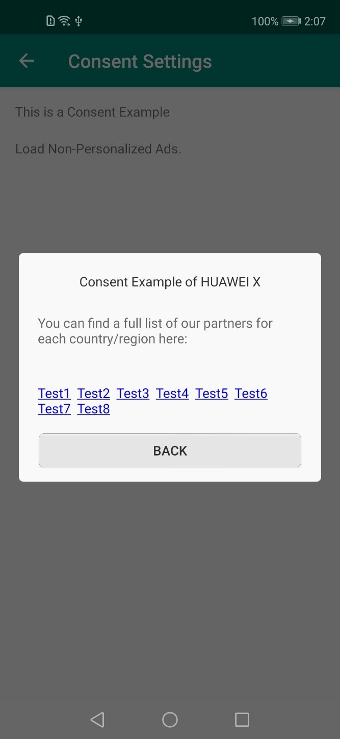 为了征求用户意见,可以使用HUAWEI Ads平台提供的Consent SDK,也可以使用符合IAB TCF v2.0规范的CMP,详情请参见IAB TCF v2.0用户同意信息传递。