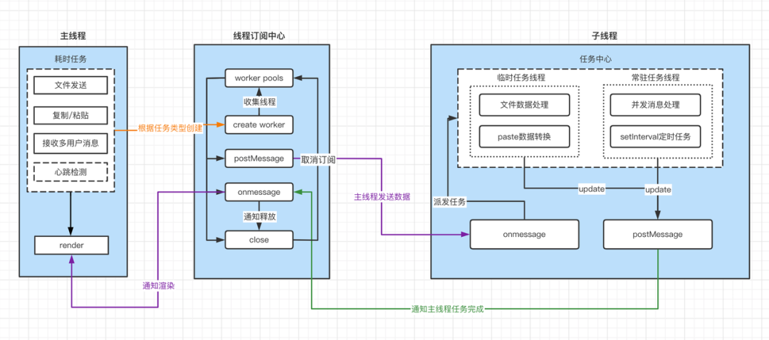 - 浏览器主子线程在执行发送文件的时候,通过子线程读取文件,在读取文件期间,主线程可以继续执行其他的任务,等到子线程读取完文件通过postMessage发送相关的信息告知主线程文件读取完毕,主线程再开始渲染。整个过程对于客服没有任何阻塞。