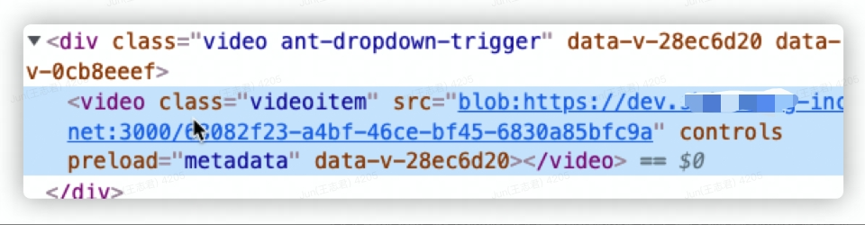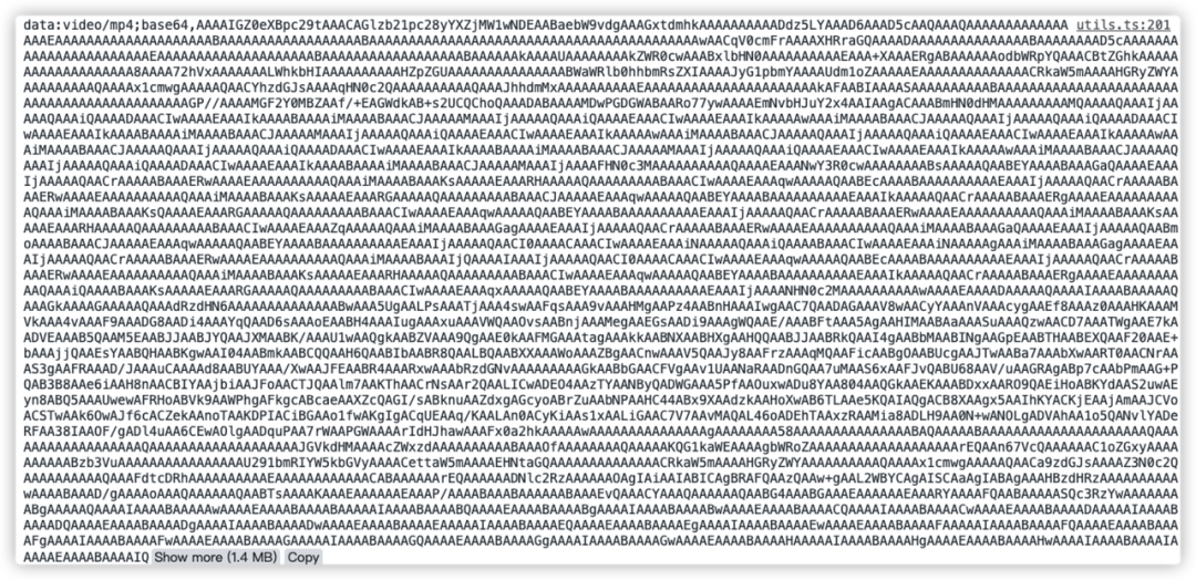 如上代码 video.setAttribute('src', target),如果用target作为视频的url在页面渲染,页面会分分钟崩溃。可以看一下1M的视频文件,通过readAsDataURL(file)读取文件内容得到是一个data:url的base64字符串,用这个字符串进行渲染,等于在页面加了一个1.4M的字符串内容,如下图所示,这样做的后果不可想象,在文件稍微大一些的话会有更加明显的卡顿。