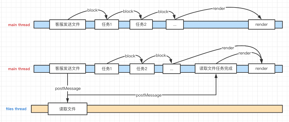 通过方案二虽然实现了文件的快速渲染,但读取文件信息如果在浏览器的主线程去做,耗时长的话,还是会阻碍客服的操作。如果这个过程能通过异步去实现,那就很完美了。JS虽然是单线程,但是浏览器提供了Web Worker的能力,让JS也能通过异步的方式和主线程进行通信。首先对比下浏览器主线程执行和主子线程执行的区别,如下图所示: