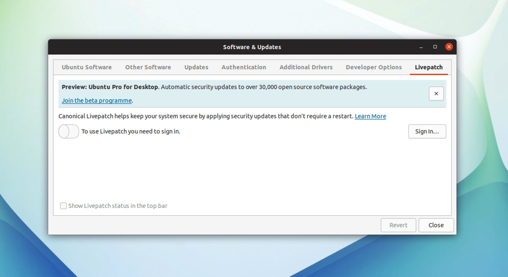 在最多 5 台设备上免费订阅 Ubuntu Pro 测试版。了解更多信息,请访问 https://ubuntu.com/pro
